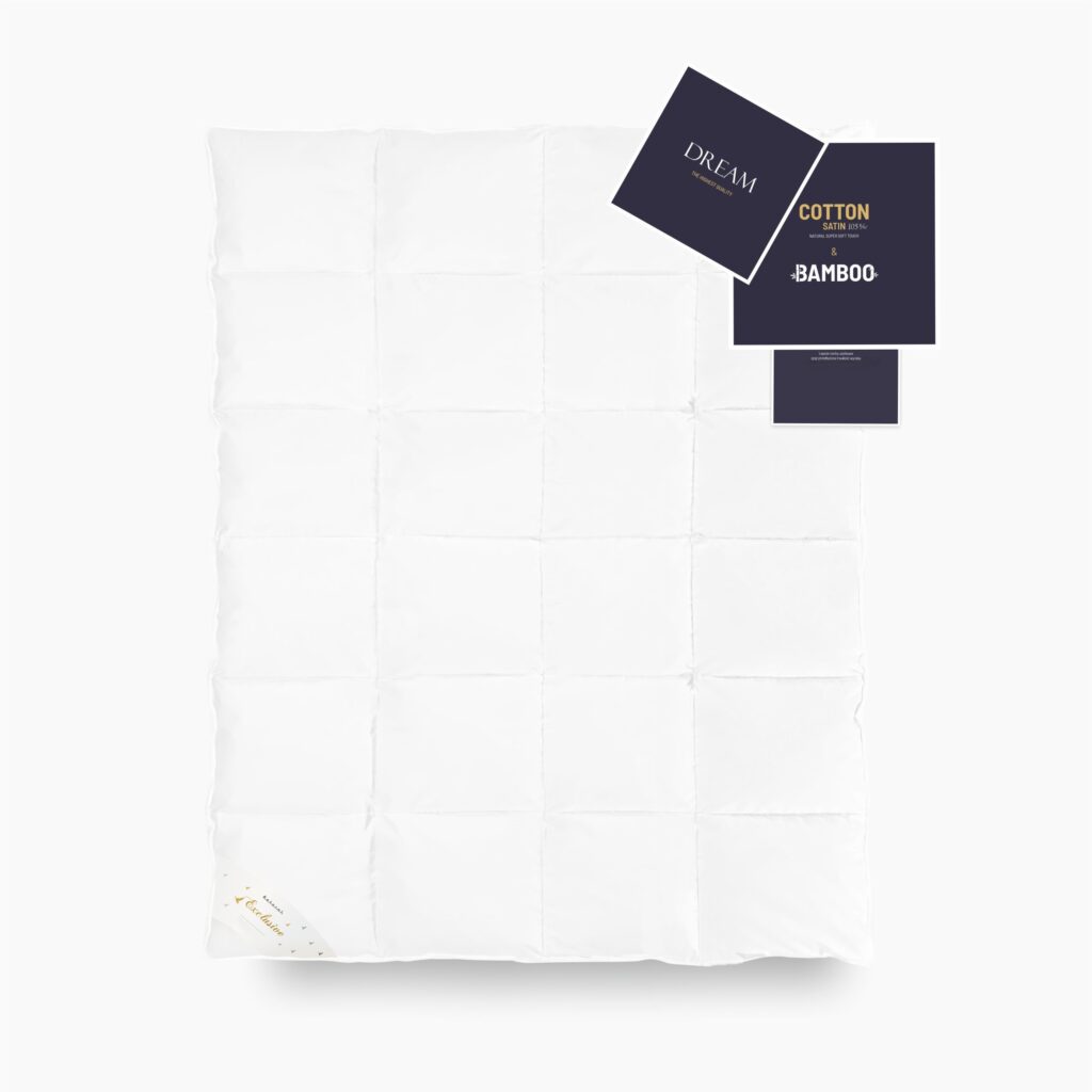 Całoroczna, miękko otulająca kołdra i poduszki serii Dream wypełnione 90% polskim, uszlachetnionym puchem gęsim o wyporności 700 cuin oraz 10% miękkich, drobnych piórek puchowych.